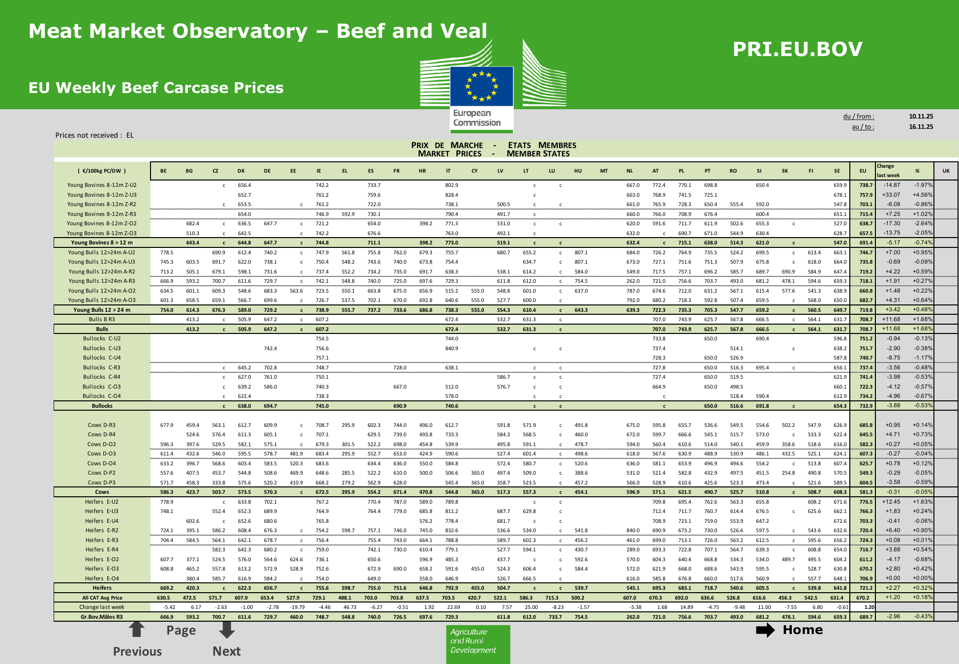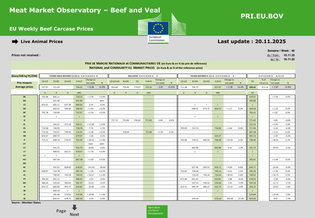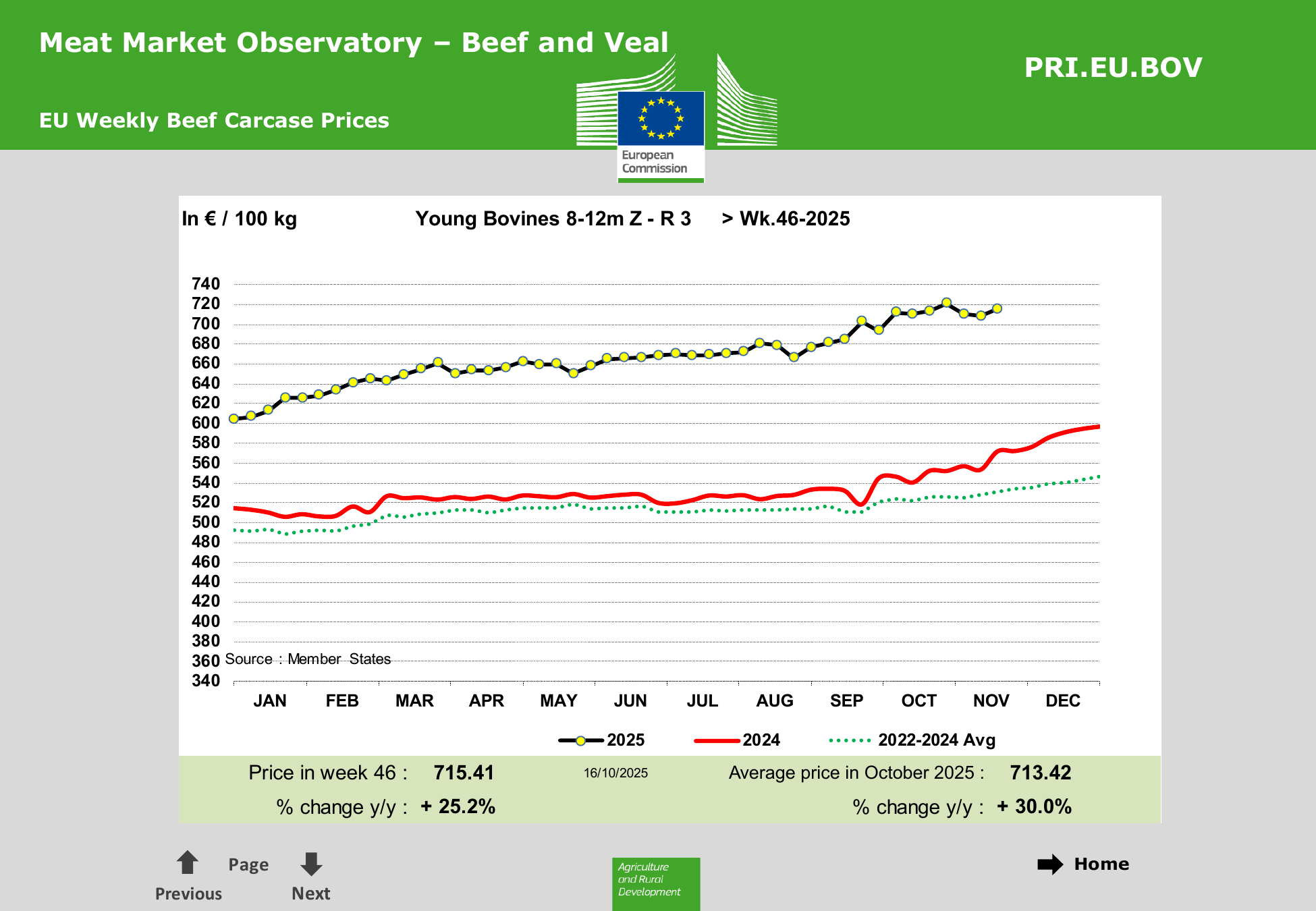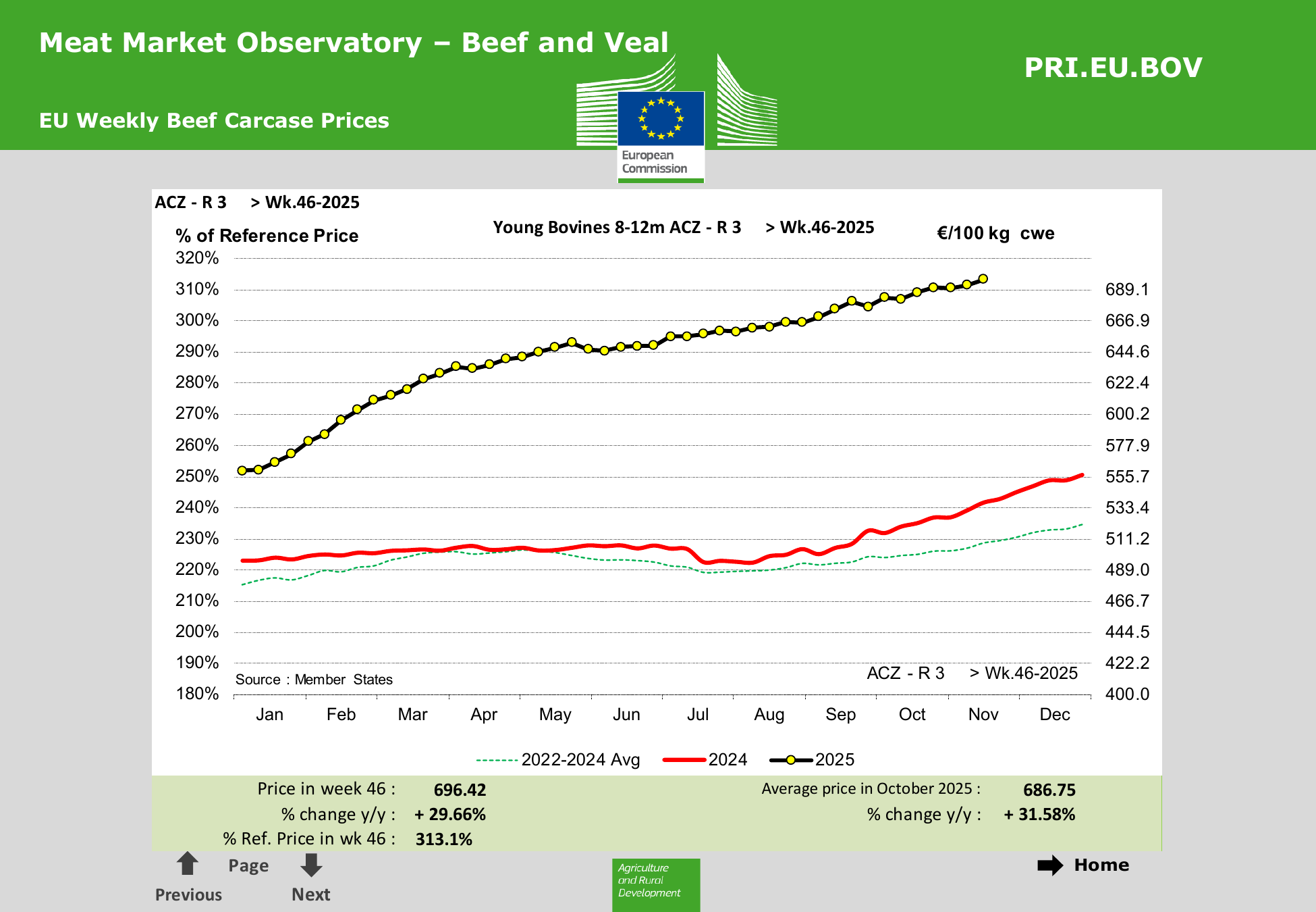 Prema najnovijem izveštaju Meat Market Observatory – European Commission, cene goveđeg mesa, teladi i tovne stoke u Evropskoj uniji nastavile su rast u nedelji od 10. do 16. novembra 2025. godine. U gotovo svim kategorijama zabeležen je snažan godišnji rast, uz stabilno povećanje potražnje.