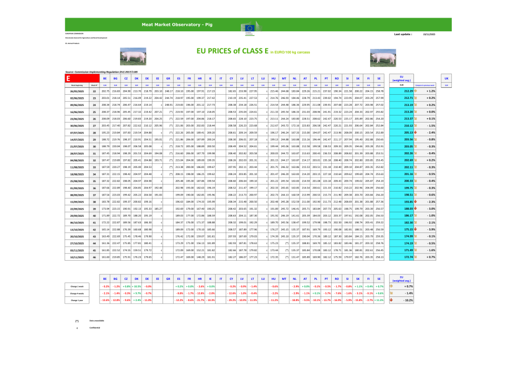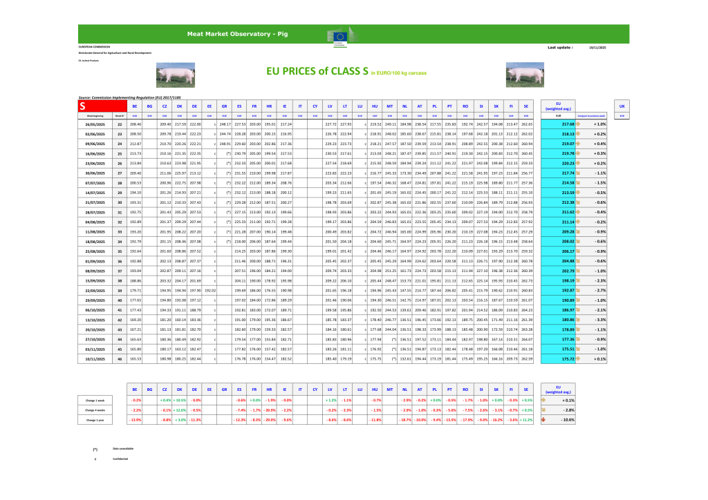 Najnoviji izveštaj Evropske komisije (Meat Market Observatory) pokazuje da su cene svinja u EU tokom nedelje 46 zabeležile blag rast, dok cena prasadi nastavlja da jača već četvrtu nedelju zaredom. Prosečna cena trupova u klasama S i E iznosi 174,7 €/100 kg, što je +0,3% više nego prethodne nedelje, dok je cena prasadi porasla na 52,5 € po komadu (+0,6%).
