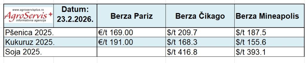 Na međunarodnim berzama 23. februara 2026. godine pšenica i kukuruz beleže stabilne nivoe, dok soja ostaje na znatno višim cenama u SAD. Pariz drži nižu cenu pšenice u odnosu na Čikago, dok je kukuruz konkurentniji na američkom tržištu. Tržište ostaje pod uticajem globalne tražnje i vremenskih rizika u glavnim proizvodnim regionima.