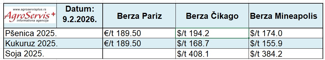 - Pšenica: Martovska pšenica (CBOT) zatvorena je na 5,28 3/4 dolara, što je pad od 1 centa. Cene su oslabile uprkos skoku izvoznih isporuka, jer su se trgovci fokusirali na obilnu globalnu ponudu.