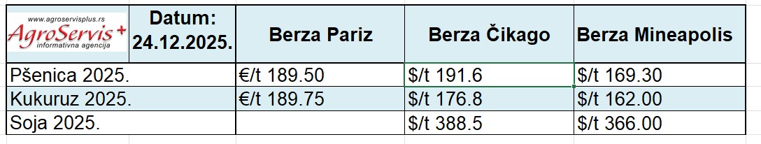 Dobici u kratkoj prazničnoj sesiji predvodila je soja, dok je snažan izvoz iz SAD i podeljena vremenska slika u Argentini (poplave na severu, suša na jugu) održala vremenski premijum u cenama. Predbožićno trgovanje u sredu završeno je rastom širom kompleksa žitarica: pšenica i kukuruz su blago ojačali, dok je soja zabeležila najizraženiji rast, u uslovima slabe praznične likvidnosti i uz balansiranje između pozitivnih izvoznih signala, vremenskih rizika u Južnoj Americi i novih bezbednosnih vesti iz Crnog mora.