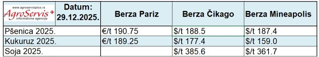 Čikaško tržište započinje ponedeljak uglavnom u padu: pšenica, kukuruz i soja beleže blago slabljenje, dok tržište ulazi u poslednja tri trgovačka dana 2025. godine uz ograničen vikend-tok vesti, odložene izveštaje američke vlade i snažan fokus na naslove iz Crnomorskog regiona i vremenske rizike u Južnoj Americi.