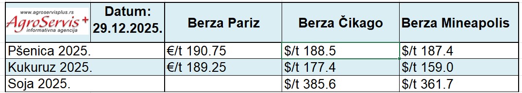 Čikaško tržište započinje ponedeljak uglavnom u padu: pšenica, kukuruz i soja beleže blago slabljenje, dok tržište ulazi u poslednja tri trgovačka dana 2025. godine uz ograničen vikend-tok vesti, odložene izveštaje američke vlade i snažan fokus na naslove iz Crnomorskog regiona i vremenske rizike u Južnoj Americi.