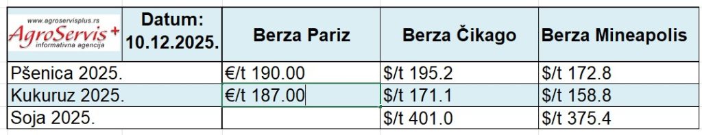 Kukuruz je vratio deo rasta od utorka, pri čemu je decembarski 2025. CBOT kukuruz zatvoren na $4.34¾ po bušelu, što je pad od 6 centi, jer su fjučersi bledeli od post-WASDE maksimuma. Nacionalni indeks gotovinskog kukuruza u SAD pao je na $3.99, dok su podaci EIA pokazali da proizvodnja etanola opada na 1,105 miliona barela dnevno, tek nešto ispod prošlonedeljnog rekorda, a zalihe su u suštini ravne na 22,51 miliona barela. Podaci NASS-a o drobljenju žitarica (Grain Crushings) pokazali su da je drobljenje kukuruza u septembru iznosilo 435,36 miliona bušela, manje u odnosu na prošlu godinu, ali je upotreba u oktobru bila 476,4 miliona bušela, što je porast od 2,8% u odnosu na prošlu godinu i gura kukuruz koji se koristi za etanol nešto iznad prošle sezone u prva dva meseca marketinške godine. Spekulanti su nastavili da ublažavaju svoj medveđi stav, smanjivši svoju neto šort poziciju za još 31.993 ugovora na 39.523 ugovora, dok je interes za izvoz bio naglašen kupovinom 136.000 tona od strane Južne Koreje i tajvanskim tenderom za 65.000 tona, uoči četvrtka i izveštaja o prodaji izvoza (Export Sales report).