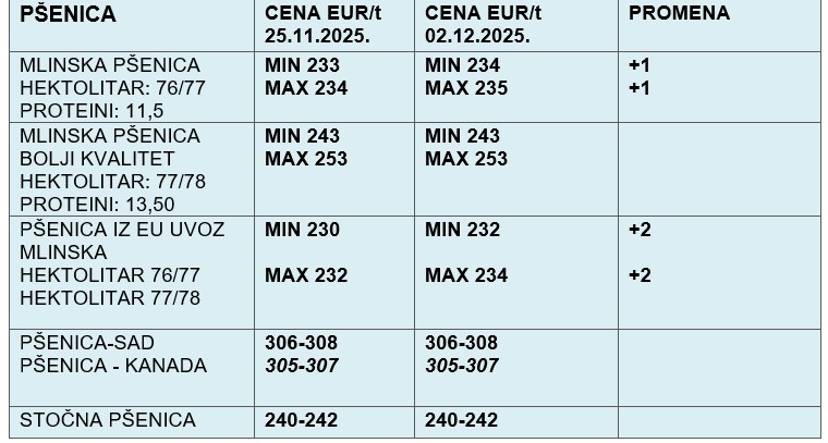 Cena mlinske pšenice standardnog kvaliteta porasla je za 1 €/t, dok je viši kvalitet zadržao stabilne vrednosti. Najveće pomeranje zabeleženo je kod pšenice iz EU uvoza, gde su minimalne i maksimalne cene porasle za 2 €/t.