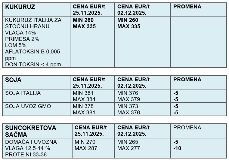 Tržište kukuruza ostalo je nepromenjeno. Cena italijanskog kukuruza za stočnu hranu, uz standardne parametre vlage i primese, ostala je u rasponu 260–335 €/t. Nedostatak promena sugeriše uravnoteženu ponudu i potražnju.