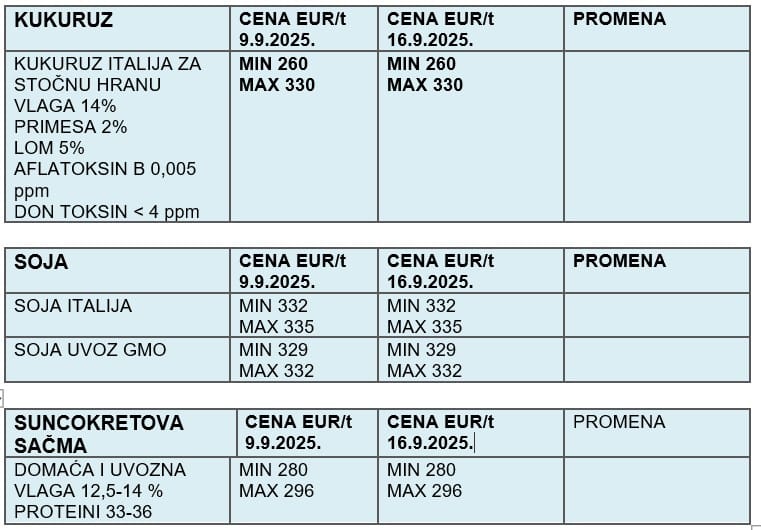 Cene suncokretove sačme, domaće i uvozne, takođe su ostale stabilne. Proizvodi sa 12,5–14% vlage i sadržajem proteina 33–36% trgovali su se po 280–296 EUR/t.