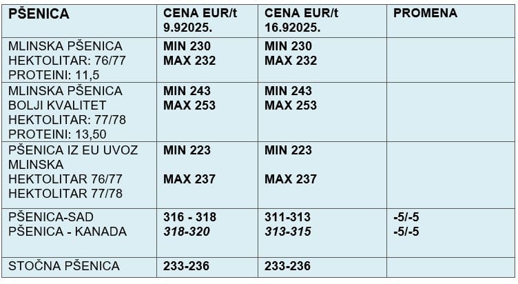 - Stočna pšenica: nepromenjena na 233–236 EUR/t.