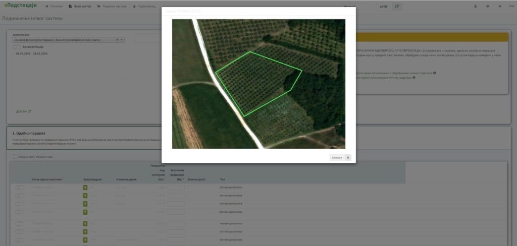 Napominjemo da će satelitske snimke parcela korisnici imati mogućnost da vide u aplikaciji ePodsticaji prilikom podnošenja zahteva za osnovne podsticaje u biljnoj proizvodnji, već od ponedeljka, 2. marta, kada će biti raspisan javni poziv po ovom osnovu.