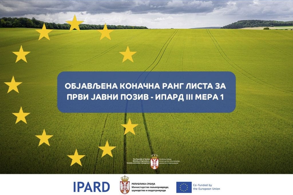 Ministarstvo poljoprivrede, šumarstva i vodoprivrede – Uprava za agrarna plaćanja objavila je Konačnu rang listu zahteva za odobravanje projekata za IPARD podsticaje u Prvom javnom pozivu za investicije u fizičku imovinu poljoprivrednih gazdinstava u okviru IPARD III programa.