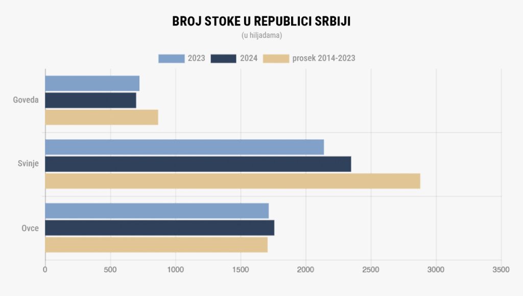 Prema poslednjim podacima objavljenim u “Zelenoj knjizi 2024” Ministarstva poljoprivrede, šumarstva i vodoprivrede, u periodu od 2020. do 2024. godine došlo je do pada broja svinja sa blizu tri miliona grla na 2,3 miliona.