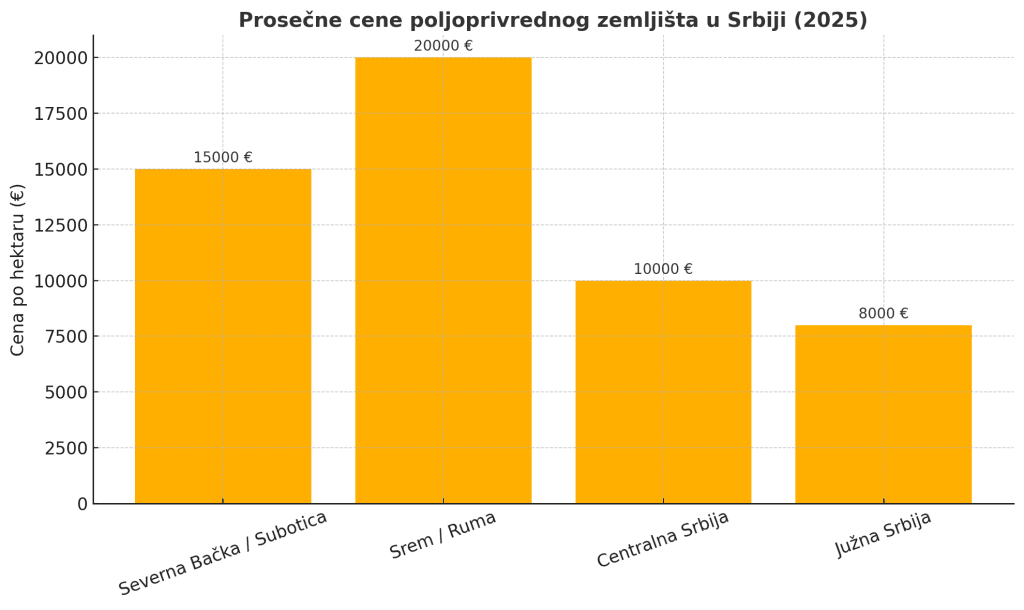 Prema procenama poljoprivrednika, realna cena zemljišta u Srbiji kreće se od 6.000 do 8.000 evra po jutru, dok u praksi cifre prelaze i 12.000 evra u zavisnosti od položaja i kvaliteta zemlje.