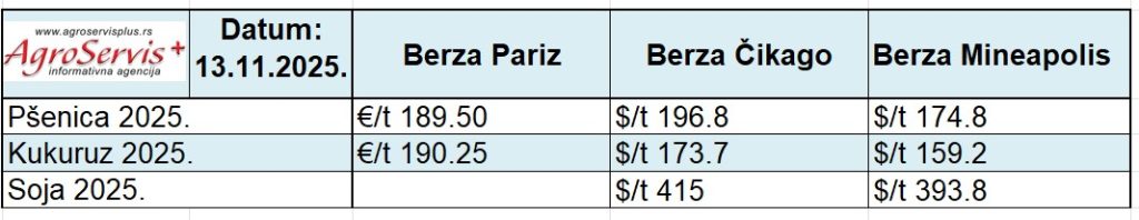 Kukuruz je ostao u uskom rasponu. Pariz je zatvorio na €190.25/t, dok je Čikago spustio na $173.7/t.