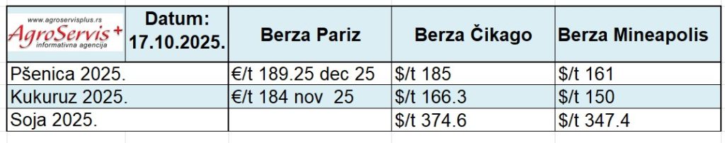 Pregled cena žitarica i uljarica u svetu – 20.10.2025. – Cene na svetskim berzama