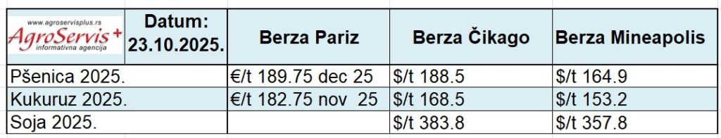 Soja je pokazala najveću volatilnost, uz kratkotrajan rast i kasniji pad. Novembarski ugovor na CBOT-u zatvoren je na 10.44 dolara po bušelu, uz rast od 10 centi. Međunarodni žitni savet smanjio je procenu globalne proizvodnje soje na 428 miliona tona, uz pad zaliha na 79 miliona tona, što ukazuje na blago pooštravanje bilansa.