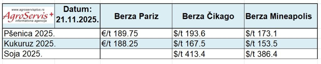 Cene pokazuju da su evropska i američka tržišta i dalje podmerenog pritiska, uz blag pad kod svih ključnih kultura. Trgovci prate dalji razvoj vremenskih prilika i političkih odluka, koje bi mogle značajno uticati na tokove cena tokom kraja godine.