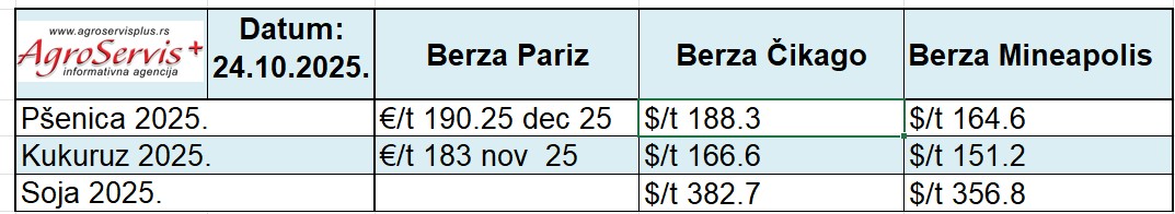 Pšenica je trgovana volatilno, ali uz blagi rast. U Čikagu je decembarski fjučers za 2025. zatvorio na $5.13/bu, dok su ugovori iz Kanzasa i Mineapolisa sledili sličan trend zahvaljujući višim cenama nafte i spekulativnim kupovinama. IGC je povećao globalnu proizvodnju pšenice za 2025/26. na 827 miliona tona, a završne zalihe na 275 miliona tona, potvrđujući obilnu globalnu ponudu.