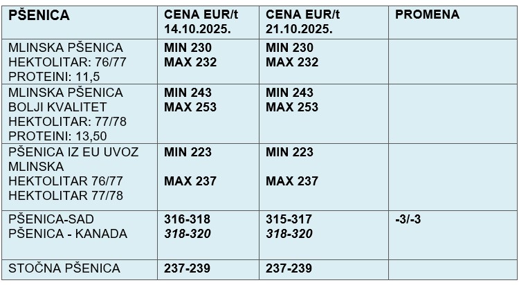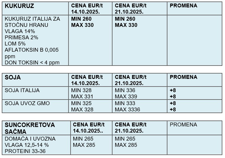 Tokom sedmice zaključno sa 21. oktobrom 2025., milanska berza zabeležila je stabilne cene osnovnih žitarica, uz rast soje za 8 €/t.