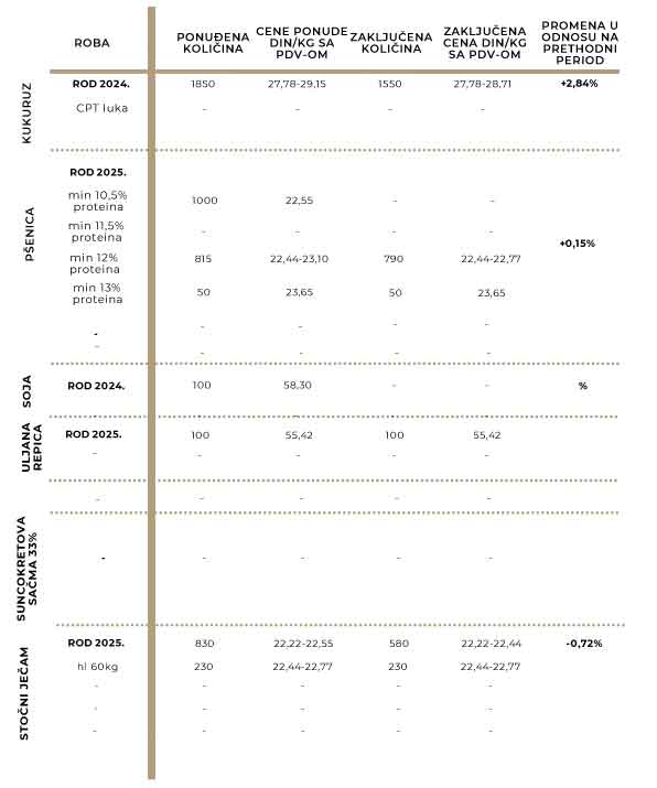 Na tržištu kukuruza beleži se najviše ponuda i najviše trgovanja. U ponudi je bilo robe različitog kvaliteta a paritet je najčešće bio taj koji je sprečavao veći broj trgovanja. Većina ponuda bila je na severu i zapadu Bačke, severu Banata, dok su kupci ove nedelje fokus usmeravali najčešće prema južnoj Bačkoj, Sremu i južnom Banatu. Berzanski ugovori zaključeni su po ceni od 25,25 do 26,10 din/kg bez PDV-a. Ponder cena iznosila je 25,63 din/kg bez PDV-a, (28,19 din/kg sa PDV-om) što je za 2,84 % više u odnosu na prošlu nedelju.