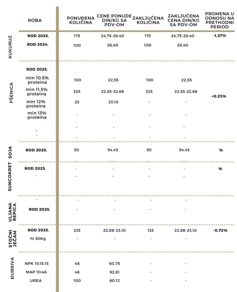 Nadajući se višoj ceni zbog lošeg ovogodišnjeg prinosa, proizvođači kukuruza nisu nudili veće količine. Kukuruzom novog roda trgovalo se po ceni od 22,50 do 24,00 din/kg bez PDV-a, u zavisnosti od analize na aflatoksin i pariteta. Ponder cena iznosila je 23,29 din/kg bez PDV-a (25,61 din/kg sa PDV-om). Kada je u pitanju rod 2024. godine, berzanski ugovor zaključen je po ceni od 24,00 din/kg bez PDV-a (26,40 din/kg sa PDV-om), pokazujući pad cene od 1,37% u odnosu na prethodnu nedelju.