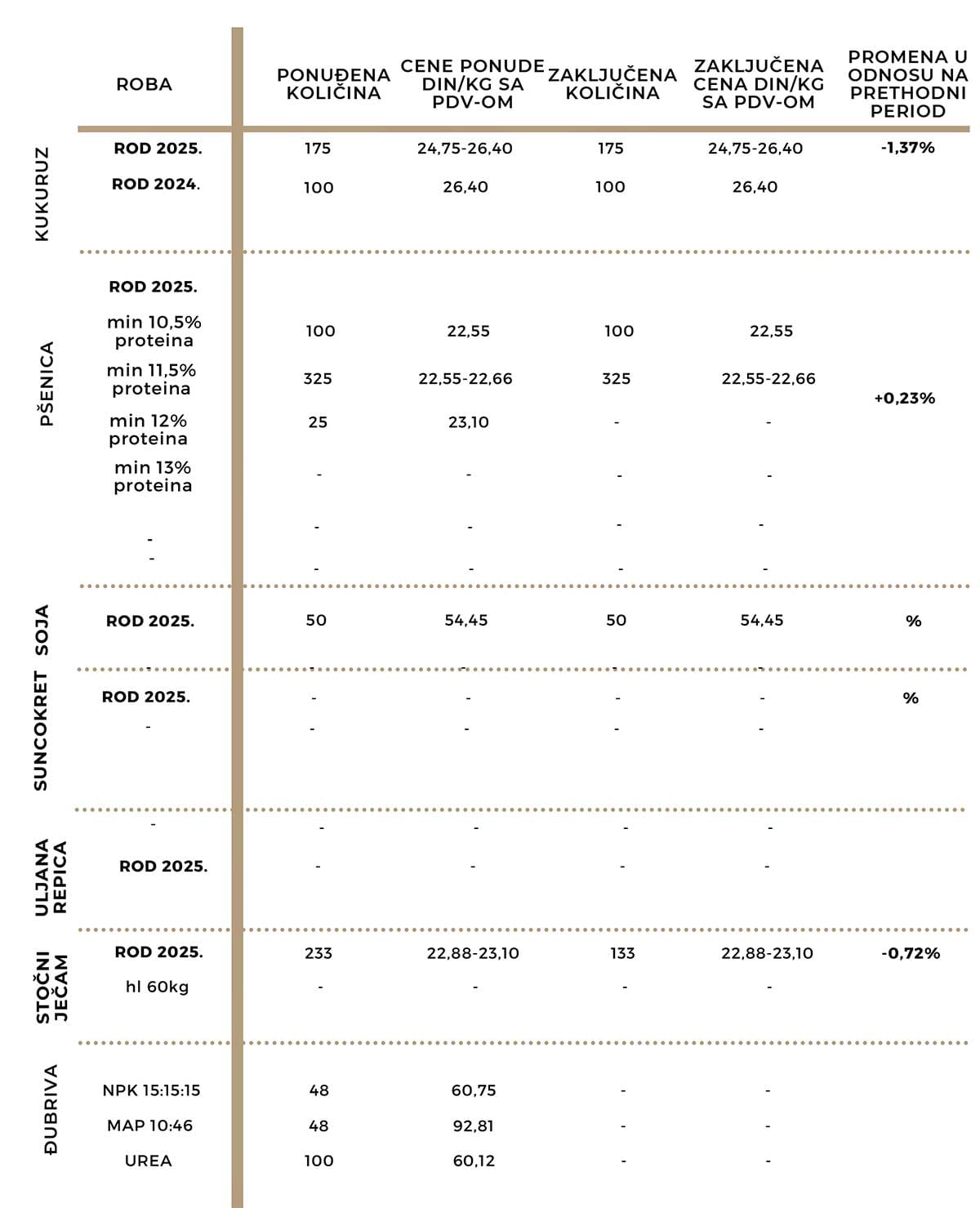 Od mineralnih đubriva, nuđen je NPK 15:15:15 u pakovanju 600/1 po ceni od 470 eur/t bez PDV-a, MAP 10:46 u pakovanju 600/1 po ceni od 720 eur/t bez PDV-a, dok je UREA u pakovanju 25/1 nuđena po ceni 460 do 465 eur/t bez PDV-a.