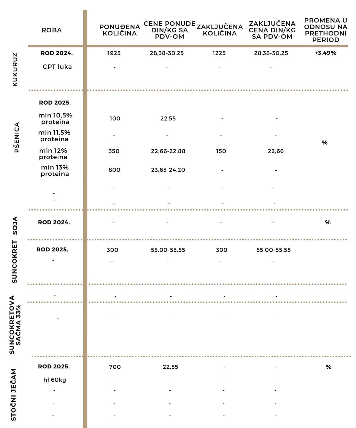 Najinteresantnije je bilo na tržištu suncokreta. Većina učesnika sa tržišta tražila je informaciju više vezano za početak žetve, prinose, kvalitet, cenu novog roda. Prvo trgovanje na SPOT tržištu zaključeno je na 50,00 din/kg bez PDV-a, dok su sledeća bila po 50,50 din/kg bez PDV-a. Ponder cena iznosila je 50,42 din/kg bez PDV-a (55,48 din/kg sa PDV-om). Sve količine ponuđene po ovim cenama našle su kupca.