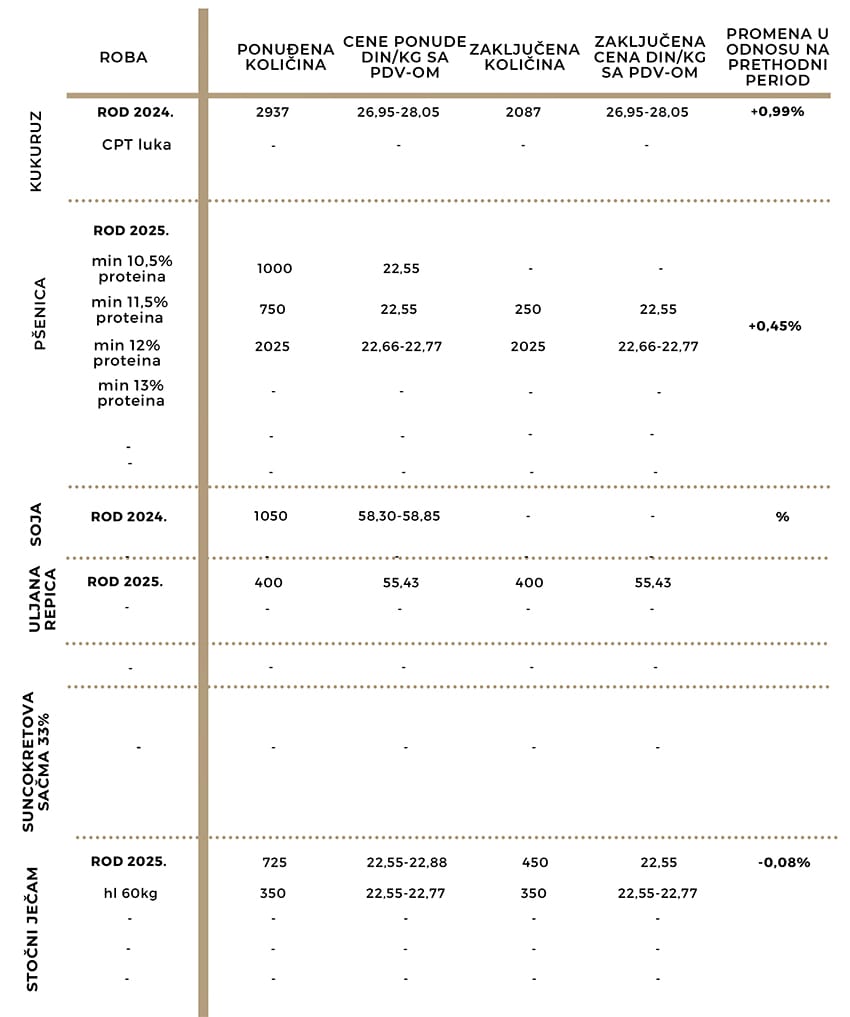 Na robno-berzanskom tržištu ove nedelje obim prometa iznosio je 6.182 tona robe, finansijske vrednosti 163.134.850,00 dinara. Stočni ječam zadržao je stabilan cenovni nivo, dok su cene pšenice i kukuruza zabeležile blagi rast.