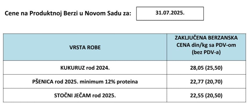 Pregled cena na Produktnoj berzi Novi Sad za 31.7.2025.
