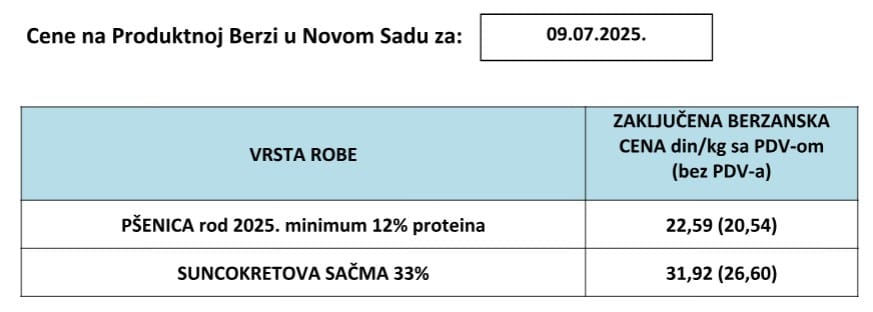 Pregled cena na Produktnoj berzi Novi Sad za 9.7.2025.