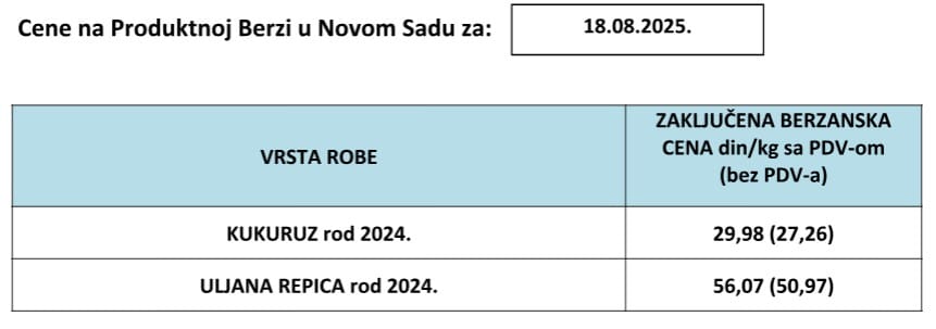 Pregled cena na Produktnoj berzi Novi Sad za 18.8.2025.