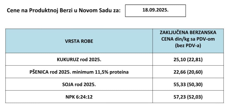 Pregled cena na Produktnoj berzi Novi Sad za 18.9.2025.