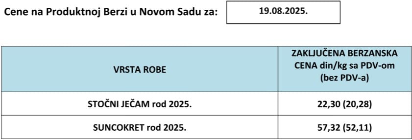 Pregled cena na Produktnoj berzi Novi Sad za 19.8.2025.