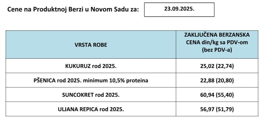 Pregled cena na Produktnoj berzi Novi Sad za 23.9.2025.