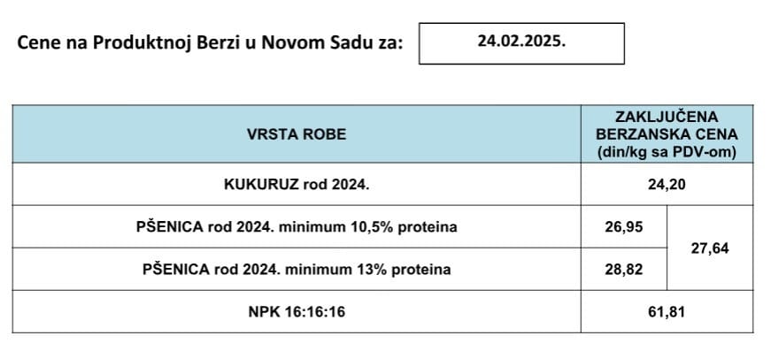 februar 25, 2025 by AgroservisPregled cena na Produktnoj berzi Novi Sad za 24.2.2025.Pratite najnovije informacije o cenama žitarica na Produktnoj berzi Novi Sad.Ovaj pregled donosi vam ažurirane podatke za 24.2.2025. pružajući uvid u aktuelne trendove na domaćem tržištu.