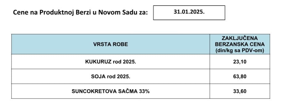 februar 3, 2025 by AgroservisPregled cena na Produktnoj berzi Novi Sad za 31.1.2025.Pratite najnovije informacije o cenama žitarica na Produktnoj berzi Novi Sad.Ovaj pregled donosi vam ažurirane podatke za 31.1.2025. pružajući uvid u aktuelne trendove na domaćem tržištu.