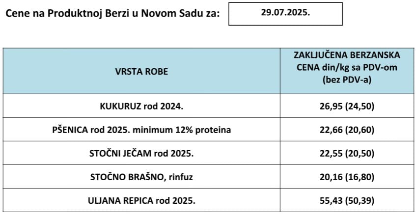 Pregled cena na Produktnoj berzi Novi Sad za 29.7.2025.