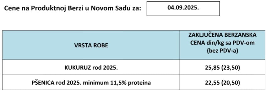 Pregled cena na Produktnoj berzi Novi Sad za 4.9.2025.