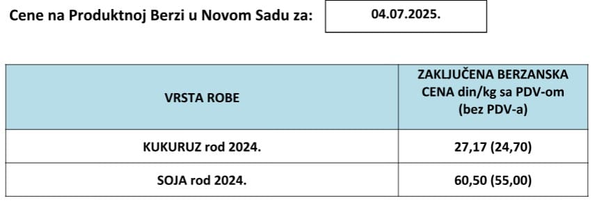 Pregled cena na Produktnoj berzi Novi Sad za 4.7.2025.