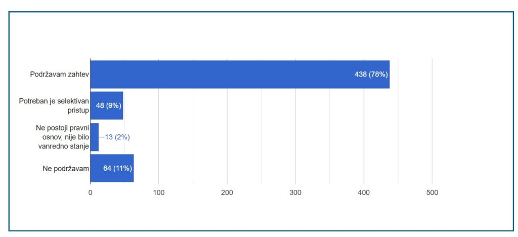 Sa druge strane, 11% učesnika (64 glasa) ne podržava ovaj zahtev, dok 9% (48 glasova) smatra da bi trebalo primeniti selektivan pristup, odnosno da pomoć dobiju samo najugroženija gazdinstva i regioni koji su pretrpeli najveće gubitke.