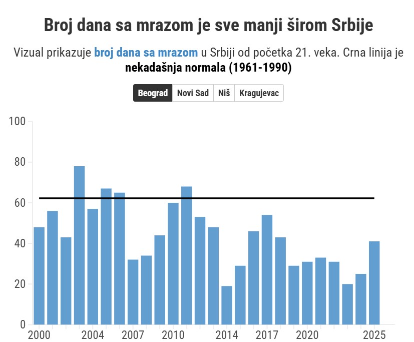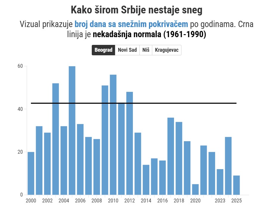Sneg je na sličan način prošle godine bio izostao i u drugim gradovima. U Kragujevcu je najviši zabeleženi snežni pokrivač takođe bio 3 centimetra, a u Novom Sadu samo dva. U Nišu, gde februara 2025. jeste bilo palo 10 cm snega, svejedno je broj dana sa snežnim pokrivačem bio daleko ispod proseka: bilo ih je samo 13 tokom 2025. godine, u odnosu na normalu koja je nekada takođe bila preko 40.