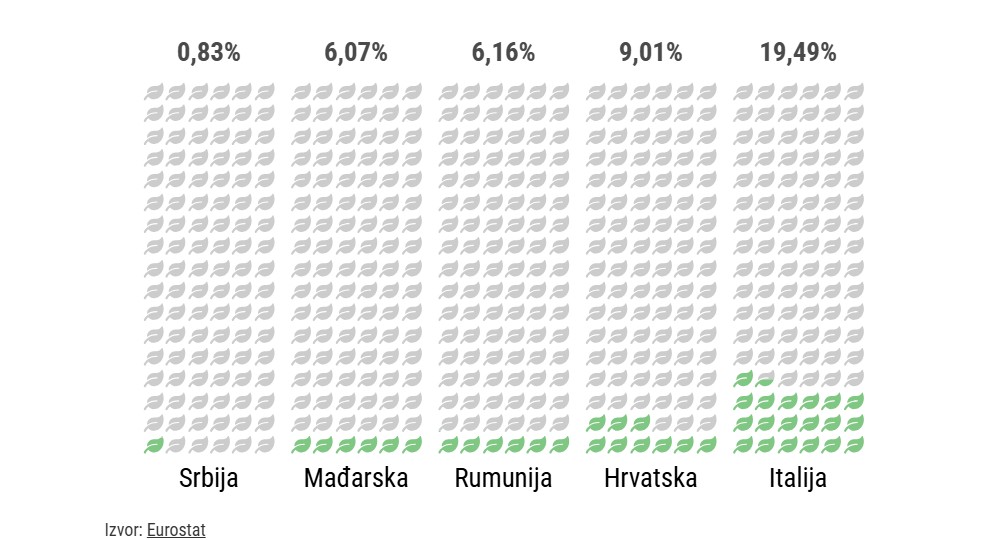 Ali u drugim zemljama kako regiona, tako i Evrope, udeo organske proizvodnje je daleko veći – a u zemljama kao što je Italija gotovo dostiže i 20%.