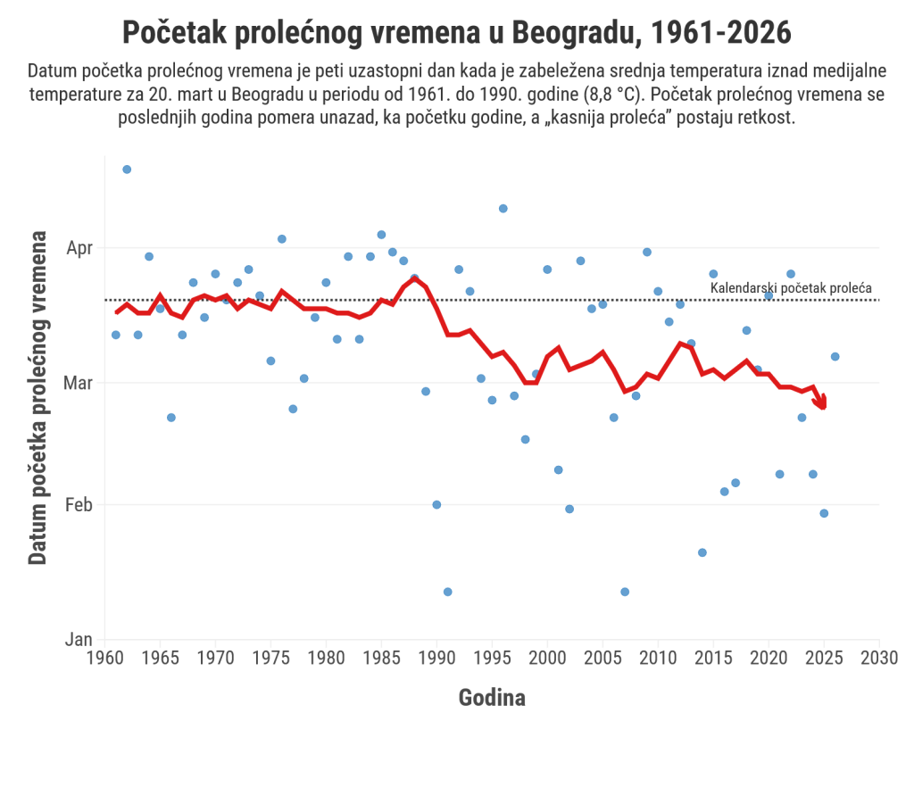 Na toplijoj planeti, Srbija se u odnosu na predindustrijski period zagrejala za 1,8 °C. Iako je porast temperature posebno izražen leti, temperatura je porasla i na dan početka proleća u Beogradu – sa 8,8 °C na 10,1 °C u poslednjoj deceniji (2016-2025).
